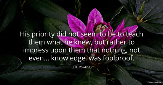 Rowling, J. K. "His priority did not seem to be to teach them what he knew, but rather to impress upon them that nothing, not even... knowledge, was foolproof." FixQuotes. January 17, 2026. https://fixquotes.com/quotes/his-priority-did-not-seem-to-be-to-teach-them-31642/.