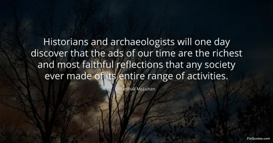 McLuhan, Marshall. "Historians and archaeologists will one day discover that the ads of our time are the richest and most faithful reflections that any society ever made of its entire range of activities." FixQuotes. January 18, 2026. https://fixquotes.com/quotes/historians-and-archaeologists-will-one-day-15886/.