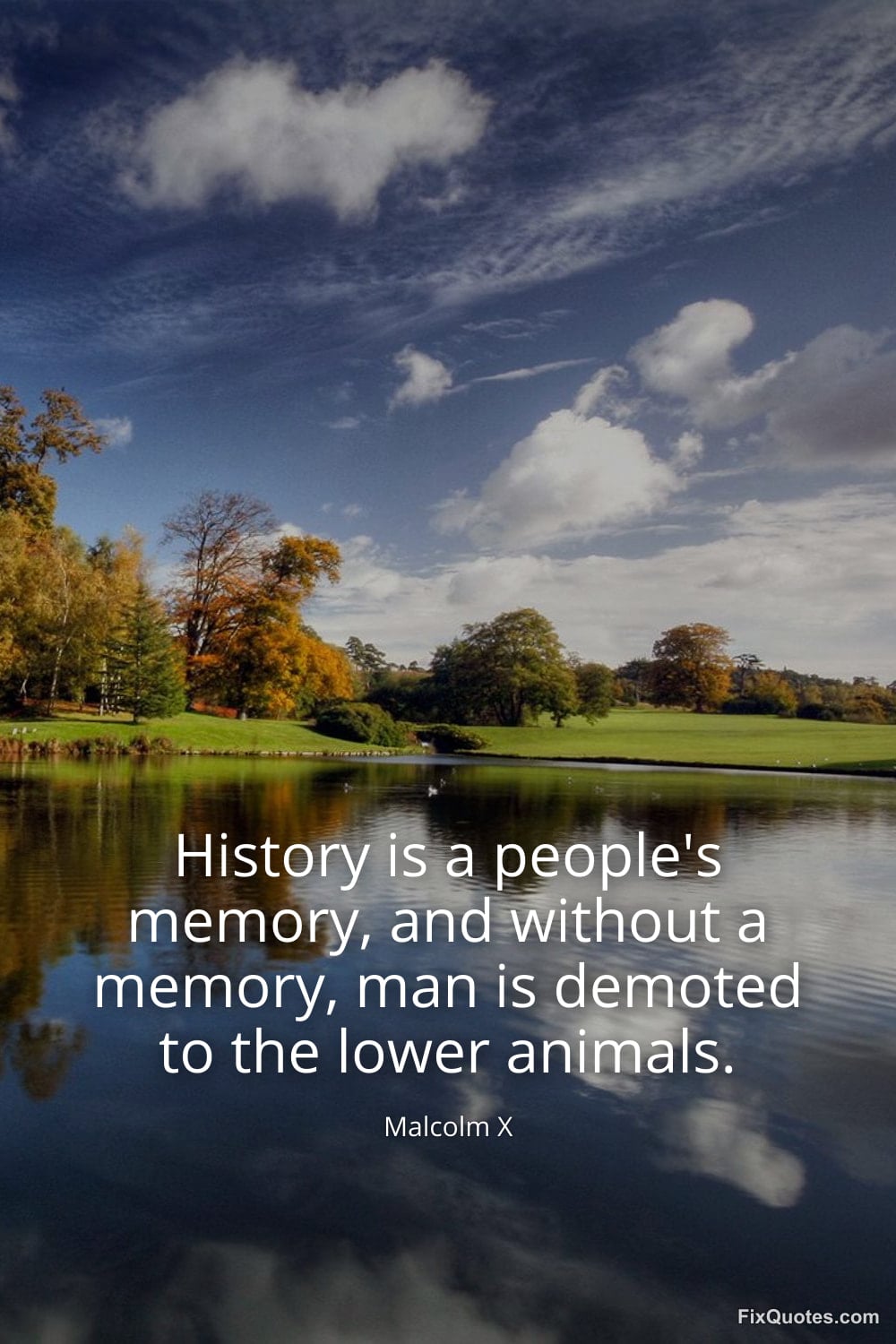 X, Malcolm. "History is a people's memory, and without a memory, man is demoted to the lower animals." FixQuotes. January 18, 2026. https://fixquotes.com/quotes/history-is-a-peoples-memory-and-without-a-memory-2481/.