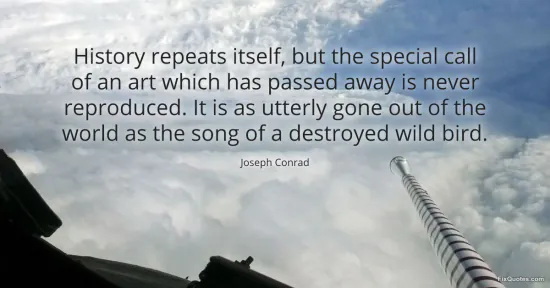 Conrad, Joseph. "History repeats itself, but the special call of an art which has passed away is never reproduced. It is as utterly gone out of the world as the song of a destroyed wild bird." FixQuotes. January 16, 2026. https://fixquotes.com/quotes/history-repeats-itself-but-the-special-call-of-an-96319/.