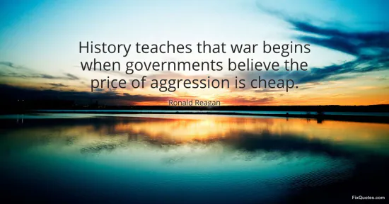 Reagan, Ronald. (2026, January 17). History teaches that war begins when governments believe the price of aggression is cheap. FixQuotes. https://fixquotes.com/quotes/history-teaches-that-war-begins-when-governments-27036/