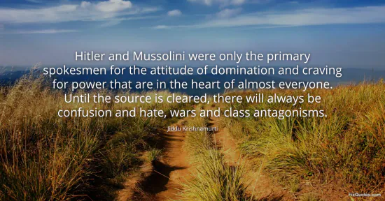 Krishnamurti, Jiddu. "Hitler and Mussolini were only the primary spokesmen for the attitude of domination and craving for power that are in the heart of almost everyone. Until the source is cleared, there will always be confusion and hate, wars and class antagonisms." FixQuotes. January 17, 2026. https://fixquotes.com/quotes/hitler-and-mussolini-were-only-the-primary-31923/.