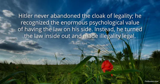 Byrd, Robert. "Hitler never abandoned the cloak of legality; he recognized the enormous psychological value of having the law on his side. Instead, he turned the law inside out and made illegality legal." FixQuotes. January 15, 2026. https://fixquotes.com/quotes/hitler-never-abandoned-the-cloak-of-legality-he-152187/.