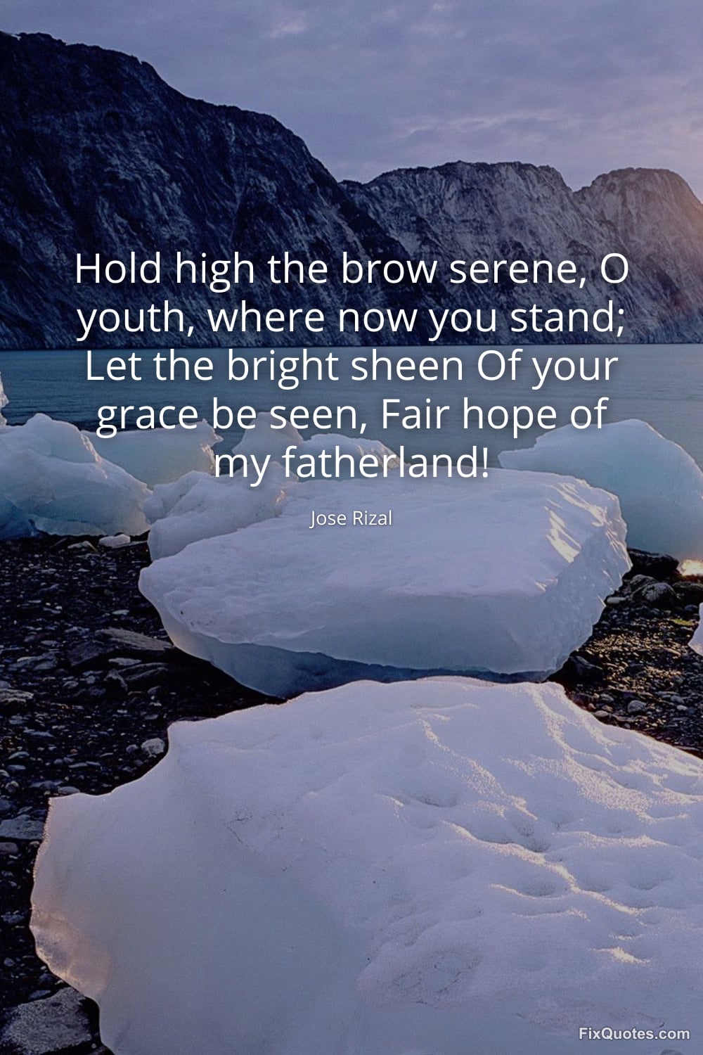Rizal, Jose. "Hold high the brow serene, O youth, where now you stand; Let the bright sheen Of your grace be seen, Fair hope of my fatherland!" FixQuotes. February 10, 2026. https://fixquotes.com/quotes/hold-high-the-brow-serene-o-youth-where-now-you-185079/.