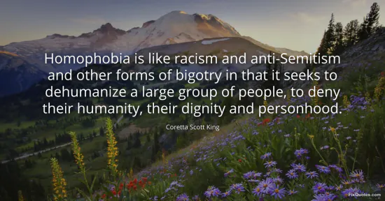 King, Coretta Scott. (2026, January 15). Homophobia is like racism and anti-Semitism and other forms of bigotry in that it seeks to dehumanize a large group of people, to deny their humanity, their dignity and personhood. FixQuotes. https://fixquotes.com/quotes/homophobia-is-like-racism-and-anti-semitism-and-41520/