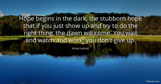 Lamott, Anne. "Hope begins in the dark, the stubborn hope that if you just show up and try to do the right thing, the dawn will come. You wait and watch and work: you don't give up." FixQuotes. January 14, 2026. https://fixquotes.com/quotes/hope-begins-in-the-dark-the-stubborn-hope-that-if-135998/.