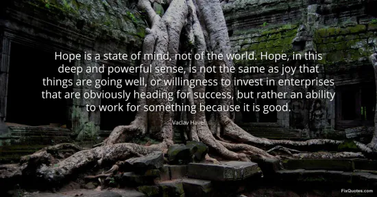 Havel, Vaclav. (2026, January 16). Hope is a state of mind, not of the world. Hope, in this deep and powerful sense, is not the same as joy that things are going well, or willingness to invest in enterprises that are obviously heading for success, but rather an ability to work for something because it is good. FixQuotes. https://fixquotes.com/quotes/hope-is-a-state-of-mind-not-of-the-world-hope-in-84796/