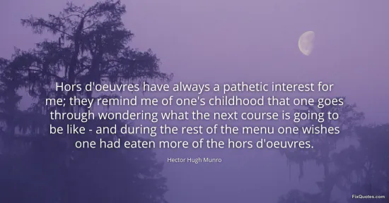 Munro, Hector Hugh. (2026, January 17). Hors d'oeuvres have always a pathetic interest for me; they remind me of one's childhood that one goes through wondering what the next course is going to be like - and during the rest of the menu one wishes one had eaten more of the hors d'oeuvres. FixQuotes. https://fixquotes.com/quotes/hors-doeuvres-have-always-a-pathetic-interest-for-72871/