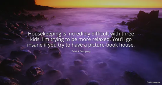 Patrick Dempsey isn’t selling domestic chaos as a cute quirk here; he’s reframing it as sanity management. The line lands because it punctures a stubborn cultural fantasy: that a well-run home is a moral achievement, and disorder is personal failure. By calling housekeeping “incredibly difficult with three kids,” he gives the mess an external cause, not an internal flaw. The point isn’t that standards are bad. It’s that certain standards are designed to be unwinnable.