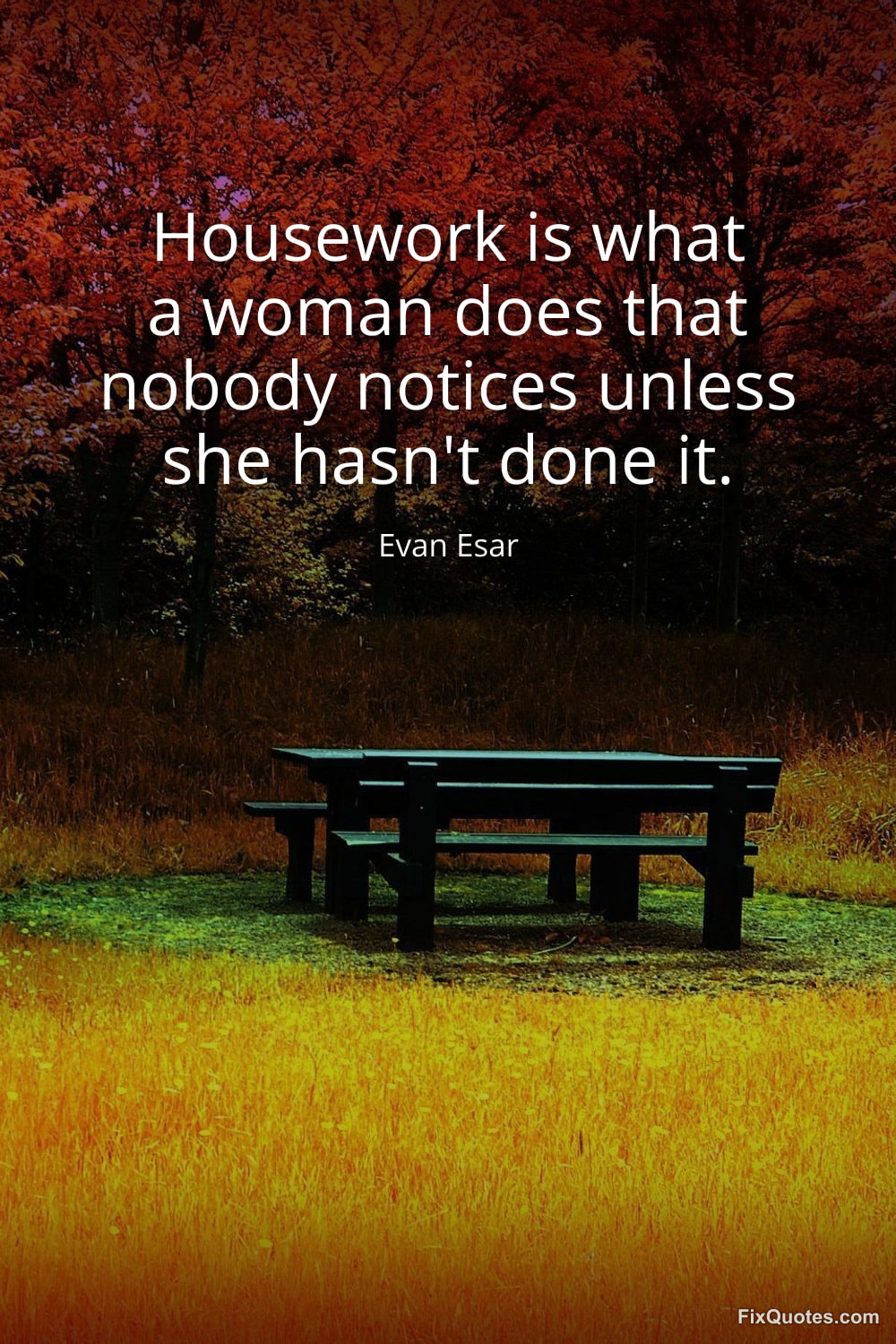 Esar, Evan. (2026, January 15). Housework is what a woman does that nobody notices unless she hasn't done it. FixQuotes. https://fixquotes.com/quotes/housework-is-what-a-woman-does-that-nobody-163451/