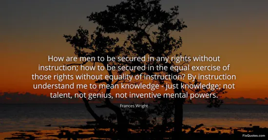 Wright, Frances. "How are men to be secured in any rights without instruction; how to be secured in the equal exercise of those rights without equality of instruction? By instruction understand me to mean knowledge - just knowledge; not talent, not genius, not inventive mental powers." FixQuotes. January 18, 2026. https://fixquotes.com/quotes/how-are-men-to-be-secured-in-any-rights-without-20899/.