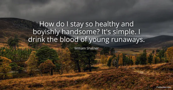 Shatner, William. "How do I stay so healthy and boyishly handsome? It's simple. I drink the blood of young runaways." FixQuotes. January 15, 2026. https://fixquotes.com/quotes/how-do-i-stay-so-healthy-and-boyishly-handsome-145562/.