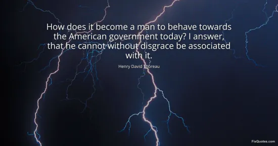 "How does it become a man to behave towards the American government today? I answer, that he cannot without disgrace be associated with it." FixQuotes, 15 Jan. 2026, https://fixquotes.com/quotes/how-does-it-become-a-man-to-behave-towards-the-137509/. Accessed 12 Feb. 2026.