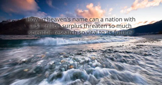 Gergen, David R. "How in heaven's name can a nation with a $1 trillion surplus threaten so much scientific research so vital to its future?" FixQuotes. January 17, 2026. https://fixquotes.com/quotes/how-in-heavens-name-can-a-nation-with-a-1-47786/.