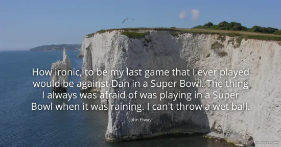 Elway, John. (2026, January 17). How ironic, to be my last game that I ever played would be against Dan in a Super Bowl. The thing I always was afraid of was playing in a Super Bowl when it was raining. I can't throw a wet ball. FixQuotes. https://fixquotes.com/quotes/how-ironic-to-be-my-last-game-that-i-ever-played-69852/