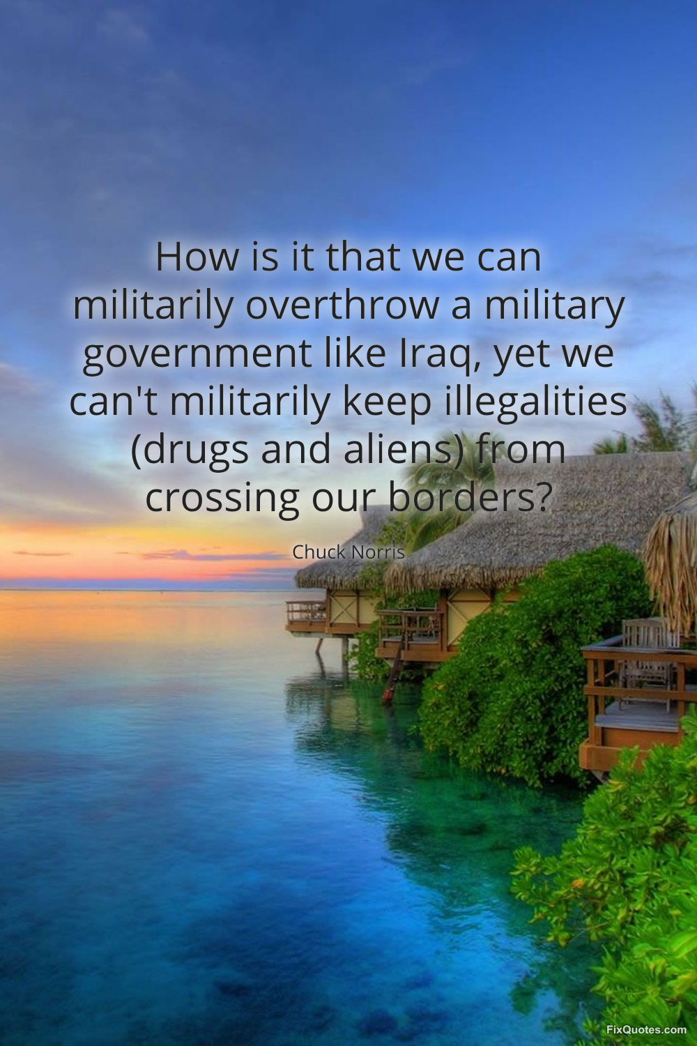 Norris, Chuck. (2026, March 20). How is it that we can militarily overthrow a military government like Iraq, yet we can't militarily keep illegalities (drugs and aliens) from crossing our borders? FixQuotes. https://fixquotes.com/quotes/how-is-it-that-we-can-militarily-overthrow-a-186239/