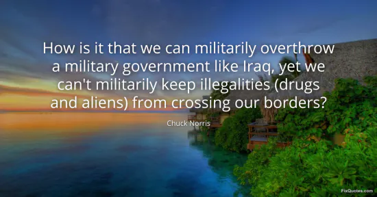 Norris, Chuck. "How is it that we can militarily overthrow a military government like Iraq, yet we can't militarily keep illegalities (drugs and aliens) from crossing our borders?" FixQuotes. March 20, 2026. https://fixquotes.com/quotes/how-is-it-that-we-can-militarily-overthrow-a-186239/.