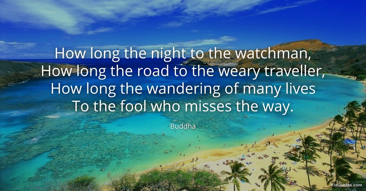 Buddha. (2026, March 10). How long the night to the watchman, How long the road to the weary traveller, How long the wandering of many lives To the fool who misses the way. FixQuotes. https://fixquotes.com/quotes/how-long-the-night-to-the-watchman-how-long-the-185936/
