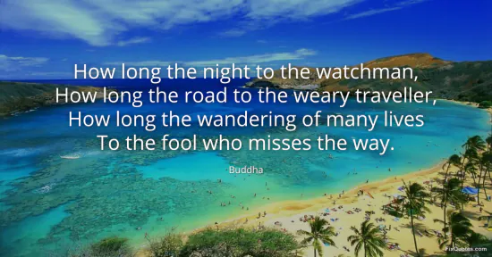 Buddha. "How long the night to the watchman, How long the road to the weary traveller, How long the wandering of many lives To the fool who misses the way." FixQuotes. March 10, 2026. https://fixquotes.com/quotes/how-long-the-night-to-the-watchman-how-long-the-185936/.