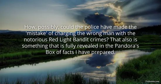 Chessman, Caryl. "How, possibly, could the police have made the 'mistake' of charging the wrong man with the notorious Red Light Bandit crimes? That also is something that is fully revealed in the Pandora's Box of facts I have prepared." FixQuotes. January 16, 2026. https://fixquotes.com/quotes/how-possibly-could-the-police-have-made-the-123666/.