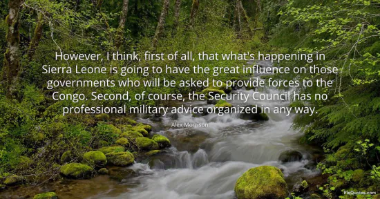 Morrison, Alex. "However, I think, first of all, that what's happening in Sierra Leone is going to have the great influence on those governments who will be asked to provide forces to the Congo. Second, of course, the Security Council has no professional military advice organized in any way." FixQuotes. Accessed February 3, 2026. https://fixquotes.com/quotes/however-i-think-first-of-all-that-whats-happening-39369/.