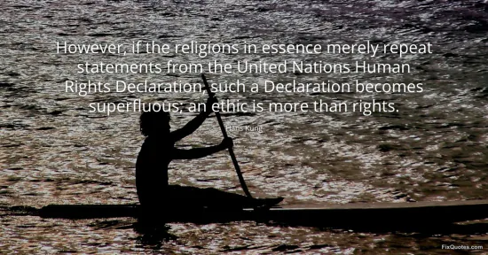 "However, if the religions in essence merely repeat statements from the United Nations Human Rights Declaration, such a Declaration becomes superfluous; an ethic is more than rights." FixQuotes, 15 Jan. 2026, https://fixquotes.com/quotes/however-if-the-religions-in-essence-merely-repeat-154509/. Accessed 21 Feb. 2026.