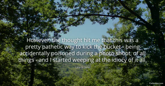 John, Lara St. "However, the thought hit me that this was a pretty pathetic way to kick the bucket - being accidentally poisoned during a photo shoot, of all things - and I started weeping at the idiocy of it all." FixQuotes. January 15, 2026. https://fixquotes.com/quotes/however-the-thought-hit-me-that-this-was-a-pretty-152688/.