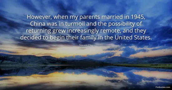 Chu, Steven. (2026, January 17). However, when my parents married in 1945, China was in turmoil and the possibility of returning grew increasingly remote, and they decided to begin their family in the United States. FixQuotes. https://fixquotes.com/quotes/however-when-my-parents-married-in-1945-china-was-73992/