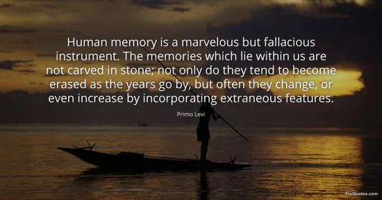 Levi, Primo. "Human memory is a marvelous but fallacious instrument. The memories which lie within us are not carved in stone; not only do they tend to become erased as the years go by, but often they change, or even increase by incorporating extraneous features." FixQuotes. January 14, 2026. https://fixquotes.com/quotes/human-memory-is-a-marvelous-but-fallacious-161645/.