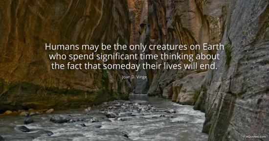 Vinge, Joan D. "Humans may be the only creatures on Earth who spend significant time thinking about the fact that someday their lives will end." FixQuotes. January 15, 2026. https://fixquotes.com/quotes/humans-may-be-the-only-creatures-on-earth-who-147114/.