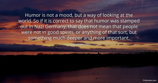 Wittgenstein, Ludwig. "Humor is not a mood, but a way of looking at the world. So if it is correct to say that humor was stamped out in Nazi Germany, that does not mean that people were not in good spirits, or anything of that sort, but something much deeper and more important." FixQuotes. February 16, 2026. https://fixquotes.com/quotes/humor-is-not-a-mood-but-a-way-of-looking-at-the-588/.