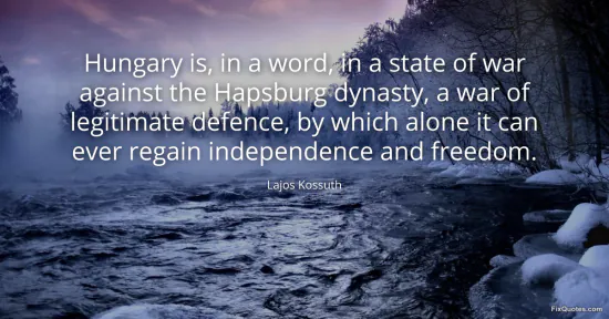 "Hungary is, in a word, in a state of war against the Hapsburg dynasty, a war of legitimate defence, by which alone it can ever regain independence and freedom." FixQuotes, 17 Feb. 2026, https://fixquotes.com/quotes/hungary-is-in-a-word-in-a-state-of-war-against-104302/. Accessed 25 Feb. 2026.