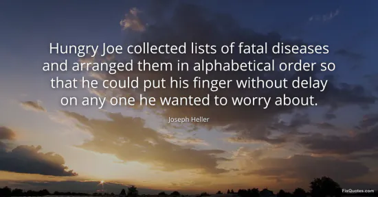 Heller, Joseph. "Hungry Joe collected lists of fatal diseases and arranged them in alphabetical order so that he could put his finger without delay on any one he wanted to worry about." FixQuotes. January 15, 2026. https://fixquotes.com/quotes/hungry-joe-collected-lists-of-fatal-diseases-and-146775/.