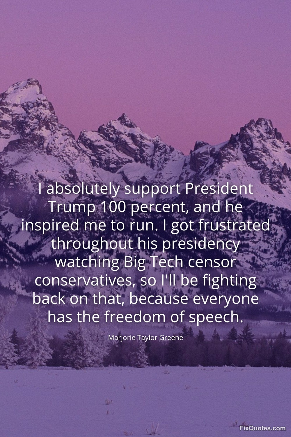 Greene, Marjorie Taylor. (2026, January 15). I absolutely support President Trump 100 percent, and he inspired me to run. I got frustrated throughout his presidency watching Big Tech censor conservatives, so I'll be fighting back on that, because everyone has the freedom of speech. FixQuotes. https://fixquotes.com/quotes/i-absolutely-support-president-trump-100-percent-173558/