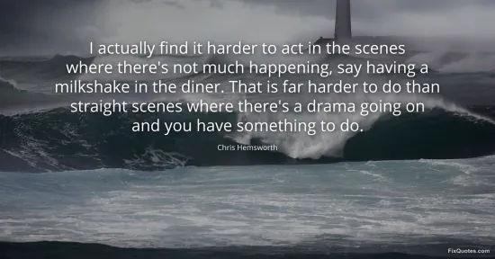 Hemsworth, Chris. "I actually find it harder to act in the scenes where there's not much happening, say having a milkshake in the diner. That is far harder to do than straight scenes where there's a drama going on and you have something to do." FixQuotes. January 16, 2026. https://fixquotes.com/quotes/i-actually-find-it-harder-to-act-in-the-scenes-108818/.