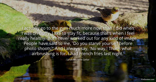 Gellar, Sarah Michelle. "I actually go to the gym much more now than I did when I was on Buffy. I like to stay fit, because that's when I feel really healthy. But I never worked out for any kind of image. People have said to me, 'Do you starve yourself before photo shoots?' And I always say, 'No way.! That's what airbrushing is for. I had French fries last night.'." FixQuotes. February 18, 2026. https://fixquotes.com/quotes/i-actually-go-to-the-gym-much-more-now-than-i-did-88081/.