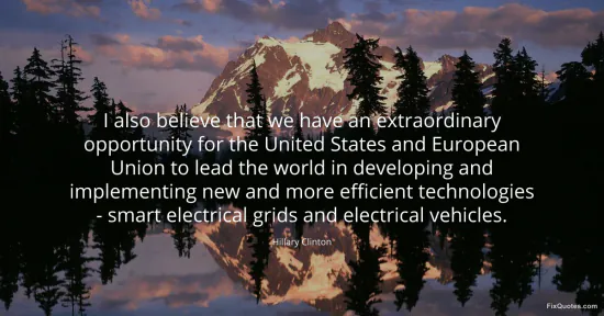 Clinton, Hillary. (2026, January 15). I also believe that we have an extraordinary opportunity for the United States and European Union to lead the world in developing and implementing new and more efficient technologies - smart electrical grids and electrical vehicles. FixQuotes. https://fixquotes.com/quotes/i-also-believe-that-we-have-an-extraordinary-31532/