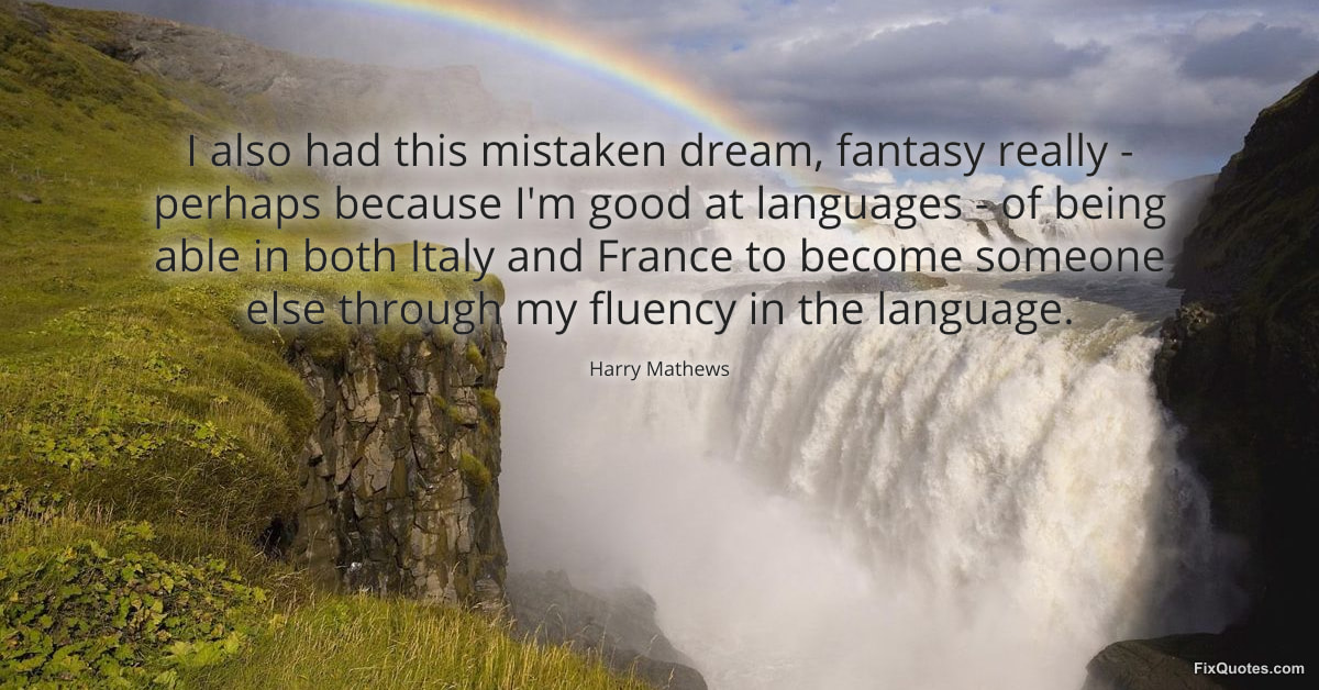 Mathews, Harry. "I also had this mistaken dream, fantasy really - perhaps because I'm good at languages - of being able in both Italy and France to become someone else through my fluency in the language." FixQuotes. January 15, 2026. https://fixquotes.com/quotes/i-also-had-this-mistaken-dream-fantasy-really-158400/.