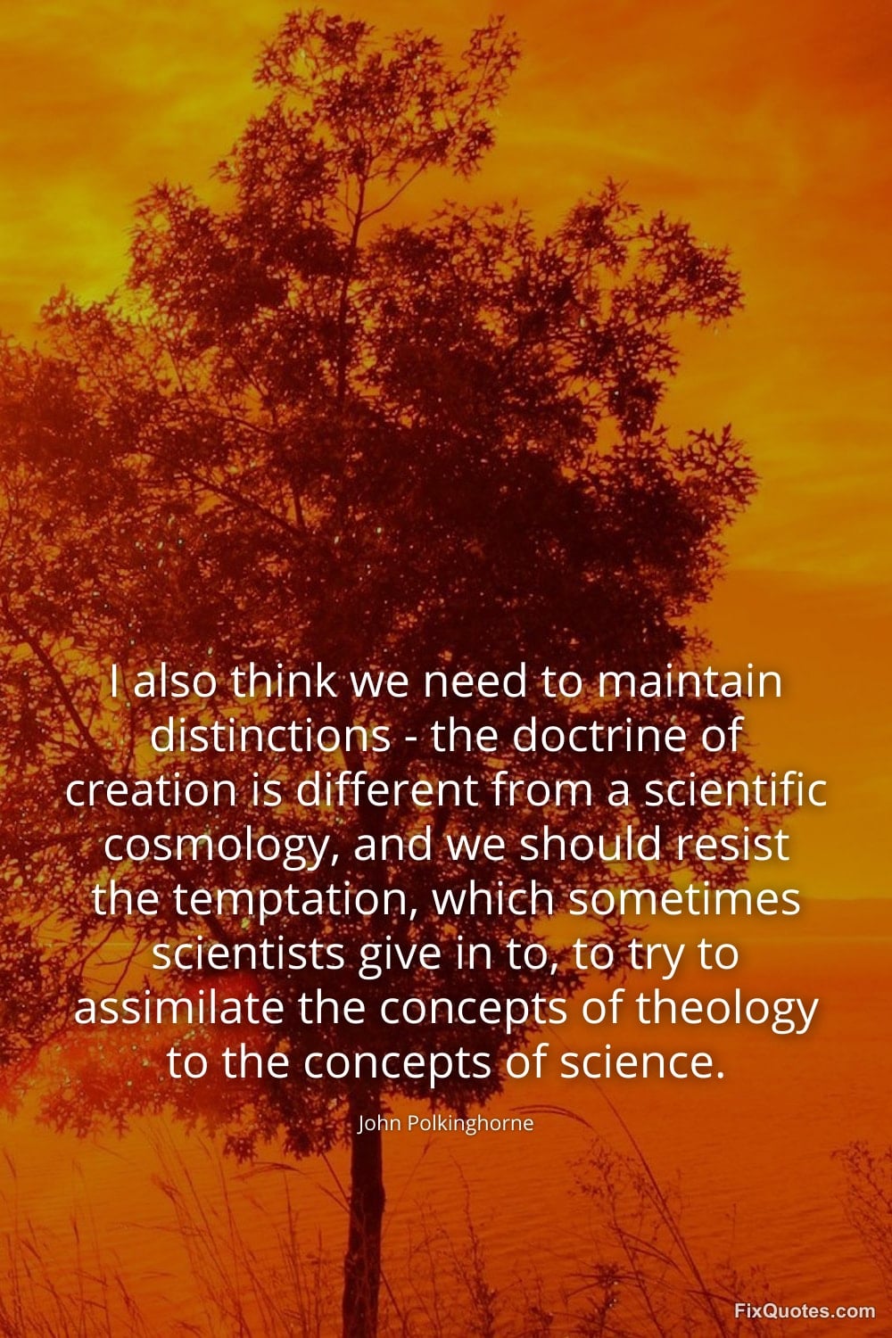 Polkinghorne, John. (2026, January 17). I also think we need to maintain distinctions - the doctrine of creation is different from a scientific cosmology, and we should resist the temptation, which sometimes scientists give in to, to try to assimilate the concepts of theology to the concepts of science. FixQuotes. https://fixquotes.com/quotes/i-also-think-we-need-to-maintain-distinctions-25423/