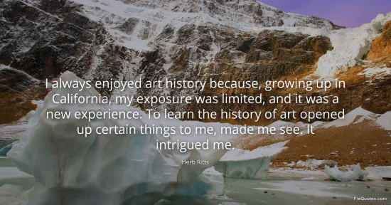 Ritts, Herb. "I always enjoyed art history because, growing up in California, my exposure was limited, and it was a new experience. To learn the history of art opened up certain things to me, made me see. It intrigued me." FixQuotes. January 16, 2026. https://fixquotes.com/quotes/i-always-enjoyed-art-history-because-growing-up-120064/.
