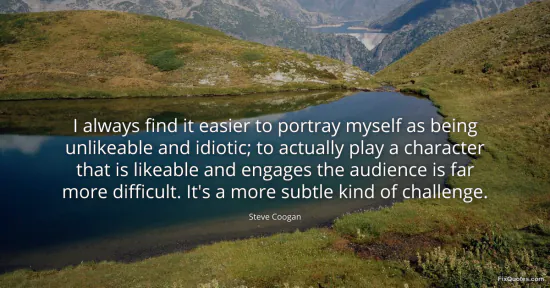 Coogan, Steve. (2026, January 17). I always find it easier to portray myself as being unlikeable and idiotic; to actually play a character that is likeable and engages the audience is far more difficult. It's a more subtle kind of challenge. FixQuotes. https://fixquotes.com/quotes/i-always-find-it-easier-to-portray-myself-as-77376/