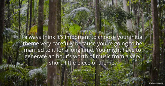 Dudley, Anne. "I always think it's important to choose your initial theme very carefully because you're going to be married to it for a long time. You might have to generate an hour's worth of music from a very short, little piece of theme." FixQuotes. January 16, 2026. https://fixquotes.com/quotes/i-always-think-its-important-to-choose-your-100678/.