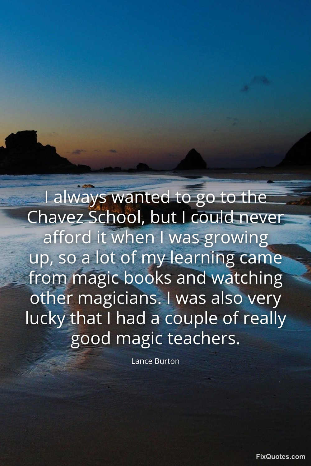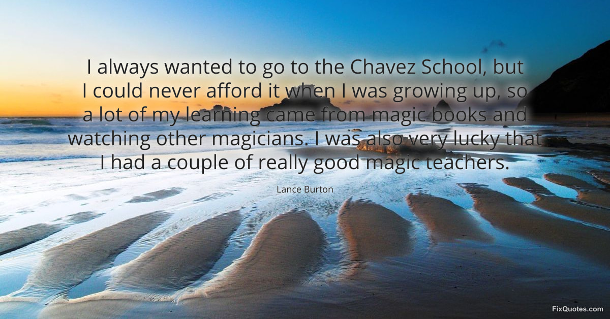 Burton, Lance. "I always wanted to go to the Chavez School, but I could never afford it when I was growing up, so a lot of my learning came from magic books and watching other magicians. I was also very lucky that I had a couple of really good magic teachers." FixQuotes. February 16, 2026. https://fixquotes.com/quotes/i-always-wanted-to-go-to-the-chavez-school-but-i-120415/.