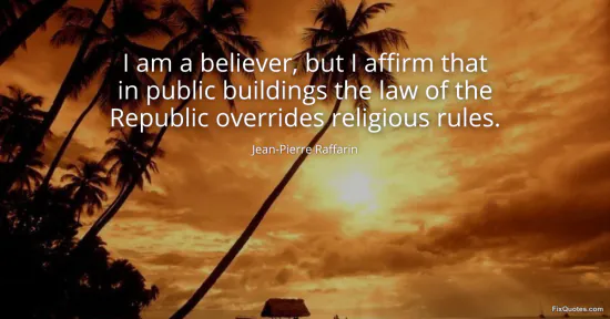 Raffarin, Jean-Pierre. (2026, January 16). I am a believer, but I affirm that in public buildings the law of the Republic overrides religious rules. FixQuotes. https://fixquotes.com/quotes/i-am-a-believer-but-i-affirm-that-in-public-102371/
