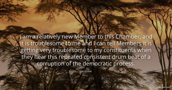 Inslee, Jay. (2026, January 15). I am a relatively new Member to this Chamber, and it is troublesome to me and I can tell Members it is getting very troublesome to my constituents when they hear this repeated consistent drum beat of a corruption of the democratic process. FixQuotes. https://fixquotes.com/quotes/i-am-a-relatively-new-member-to-this-chamber-and-160407/