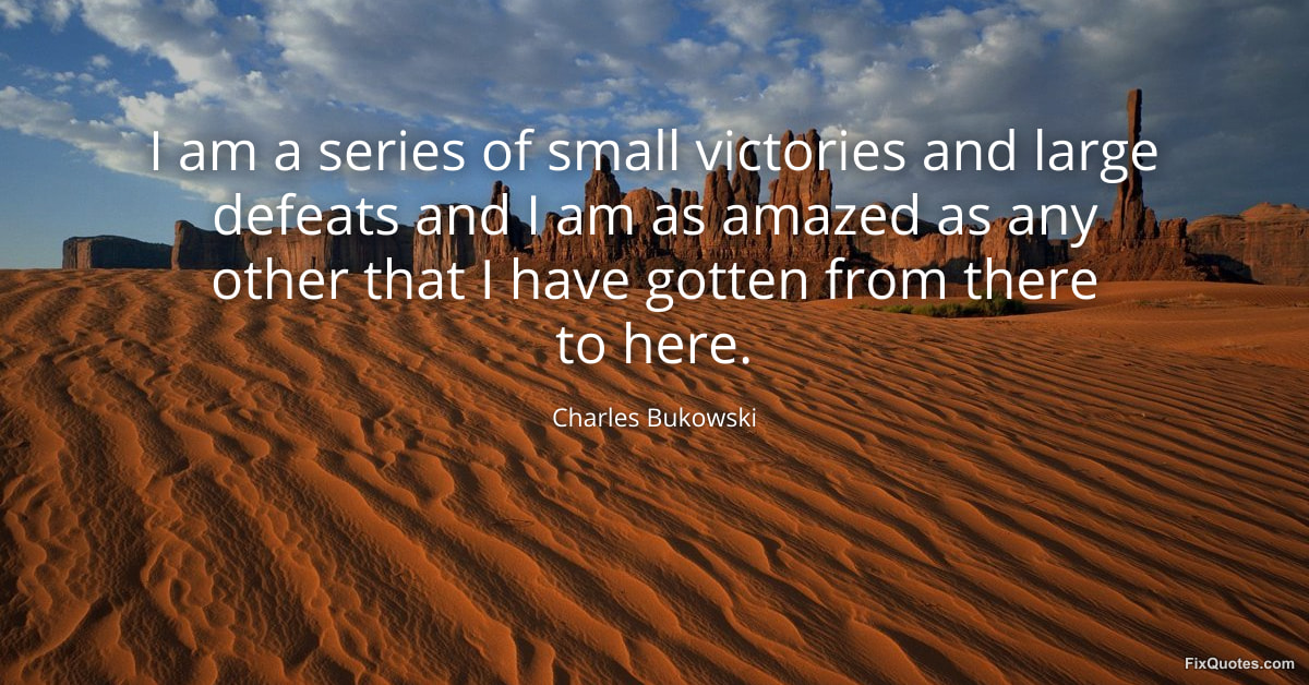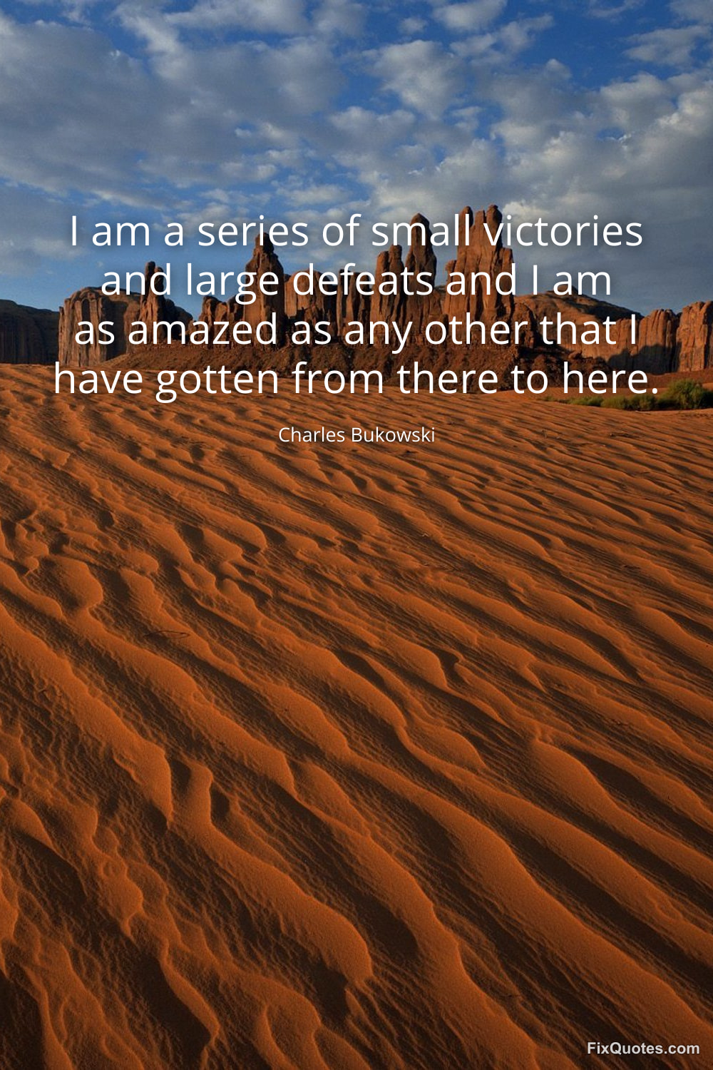 Bukowski, Charles. (2026, February 10). I am a series of small victories and large defeats and I am as amazed as any other that I have gotten from there to here. FixQuotes. https://fixquotes.com/quotes/i-am-a-series-of-small-victories-and-large-185126/