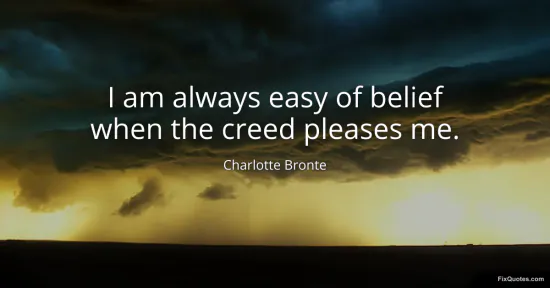 Bronte, Charlotte. "I am always easy of belief when the creed pleases me." FixQuotes. January 17, 2026. https://fixquotes.com/quotes/i-am-always-easy-of-belief-when-the-creed-pleases-59898/.