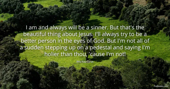 Cyrus, Billy Ray. "I am and always will be a sinner. But that's the beautiful thing about Jesus. I'll always try to be a better person in the eyes of God. But I'm not all of a sudden stepping up on a pedestal and saying I'm holier than thou, 'cause I'm not!" FixQuotes. January 16, 2026. https://fixquotes.com/quotes/i-am-and-always-will-be-a-sinner-but-thats-the-135489/.