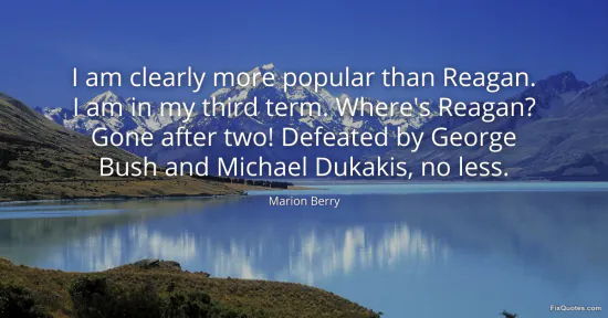 Berry, Marion. "I am clearly more popular than Reagan. I am in my third term. Where's Reagan? Gone after two! Defeated by George Bush and Michael Dukakis, no less." FixQuotes. February 16, 2026. https://fixquotes.com/quotes/i-am-clearly-more-popular-than-reagan-i-am-in-my-118987/.