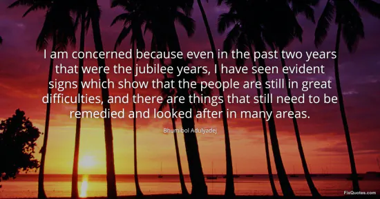 Adulyadej, Bhumibol. "I am concerned because even in the past two years that were the jubilee years, I have seen evident signs which show that the people are still in great difficulties, and there are things that still need to be remedied and looked after in many areas." FixQuotes. January 16, 2026. https://fixquotes.com/quotes/i-am-concerned-because-even-in-the-past-two-years-98257/.